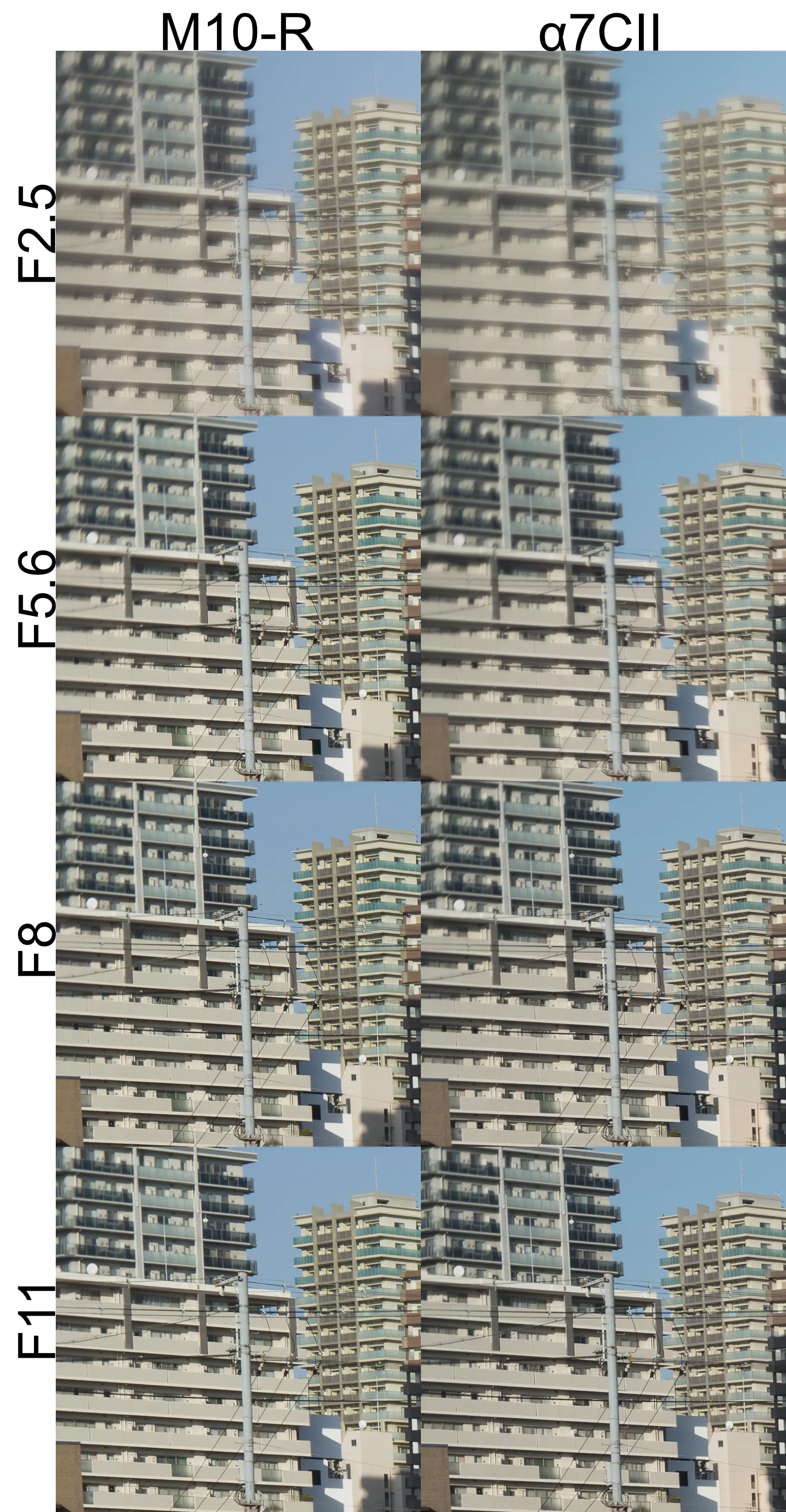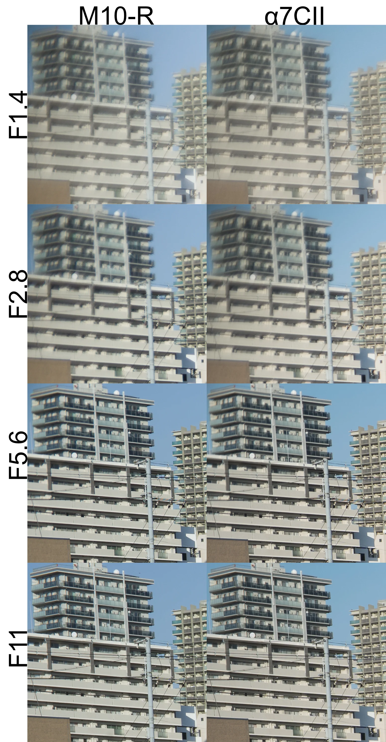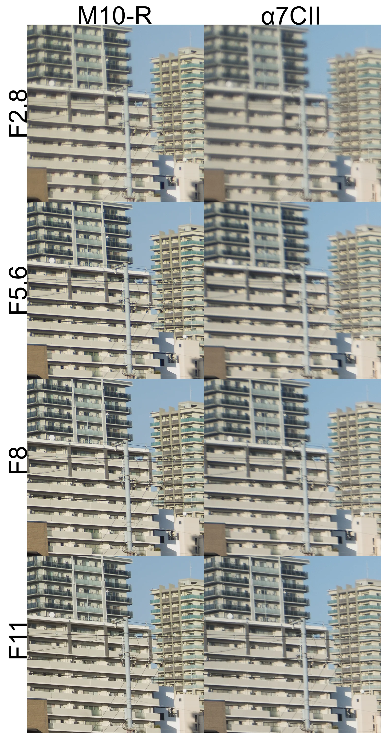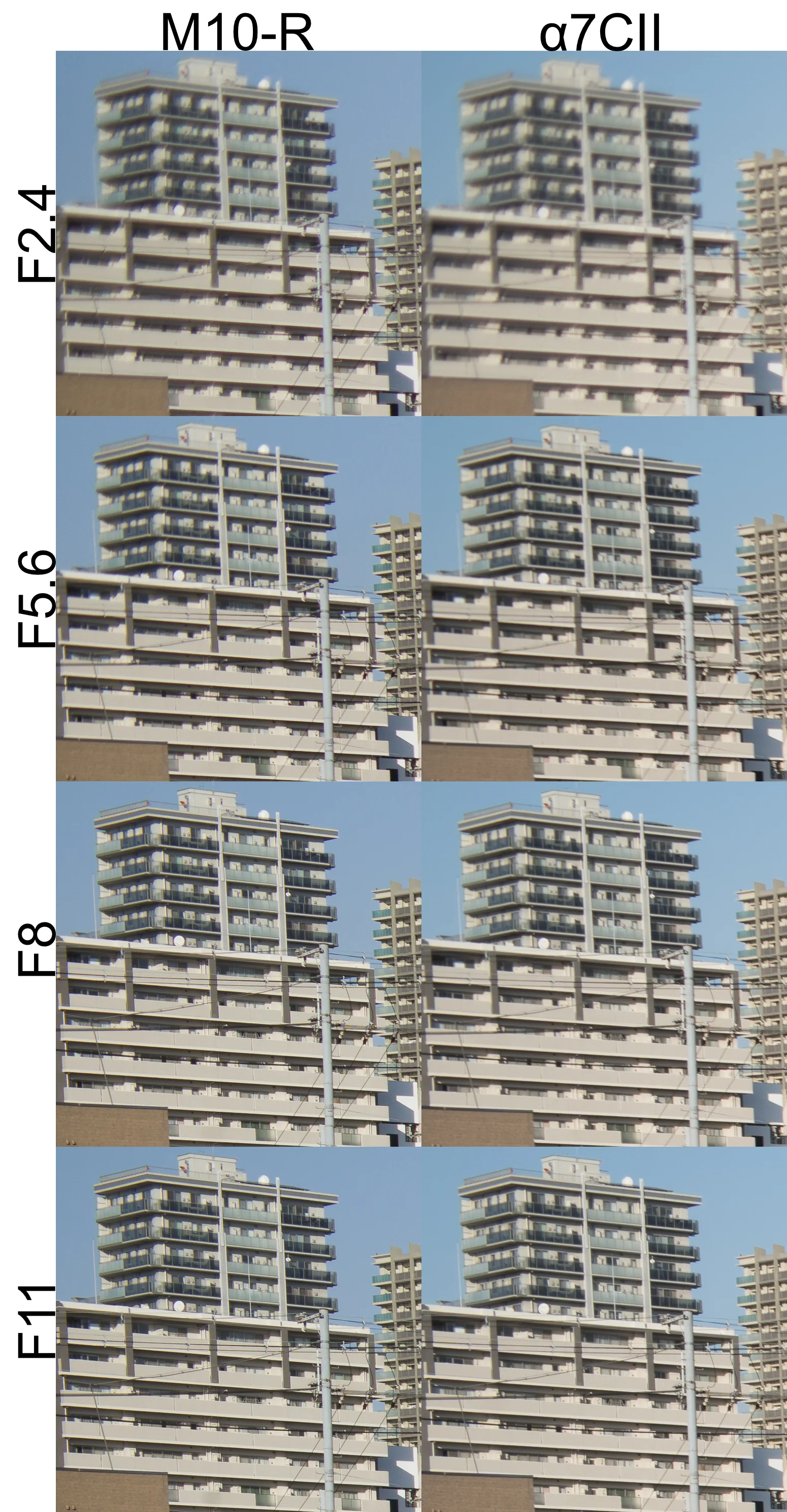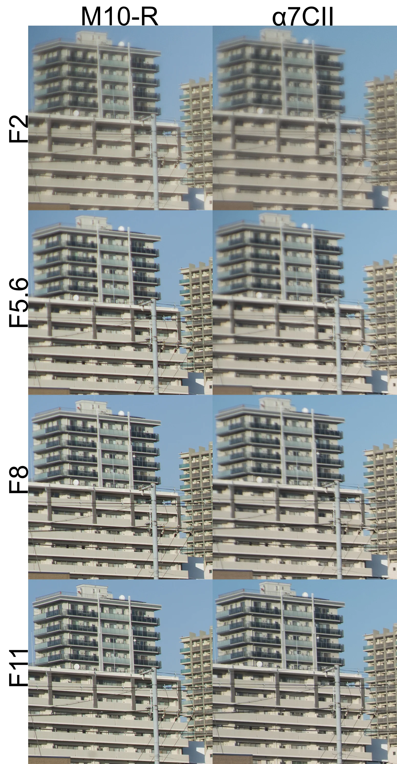 ソニーEでは絞り開放で像の流れが目立ちます。絞り込むと徐々に画質が向上するものの、ライカMの水準にまでは到達しません。